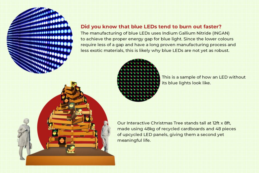 Our one-of-a-kind tree that not only brightens up our lives, but also exemplifies the essence of sustainable creativity, it stands tall, adorned with a beautiful array of upcycled LED panels and held in place by recycled cardboard, embodying the magic of the season in an extraordinary way.