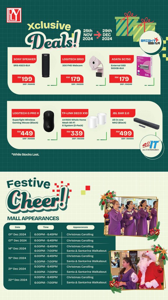 3. Exclusive Deals and Festive Cheer: From 25 November to 29 December 2024, the mall offers exclusive deals on gadgets and accessories, alongside festive appearances by carollers and Santa Claus.